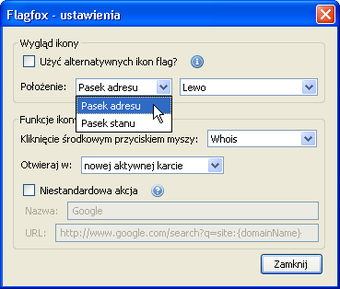 Flagfox posiada kilka ciekawych opcji. Można zażyczyć sobie wyświetlanie flagi w pasku stanu lub w pasku adresu, z lewej lub z prawej strony. Można też skopiować adres IP lub przejść do serwisu Whois celem poznania bardziej zaawansowanych danych na temat serwera, witryny i ich właścicieli. Dostępne są również wiadomości dostarczane przez Wikipedię na temat danego kraju.